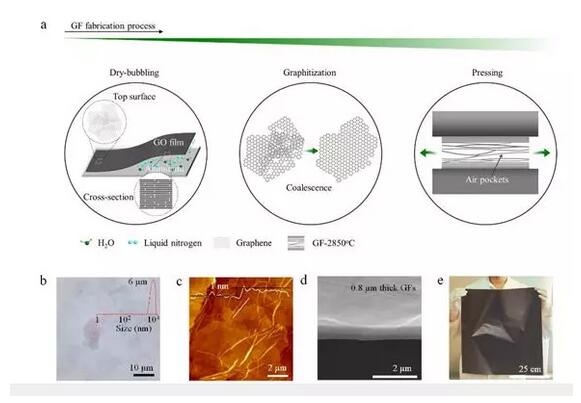 圖1. 石墨烯薄膜制造工藝. a)干法鼓泡分離薄膜,石墨化及壓延工藝示意圖. b) 高速剪切混合發(fā)制備平均直徑為6微米的氧化石墨烯光學(xué)顯微鏡照片. c) 小于1 納米厚的氧化石墨烯原子力顯微鏡照片. d) 0,8微米的石墨烯薄膜掃描顯微鏡照片. e) 柔性大面積石墨烯薄膜光學(xué)顯微鏡照片。