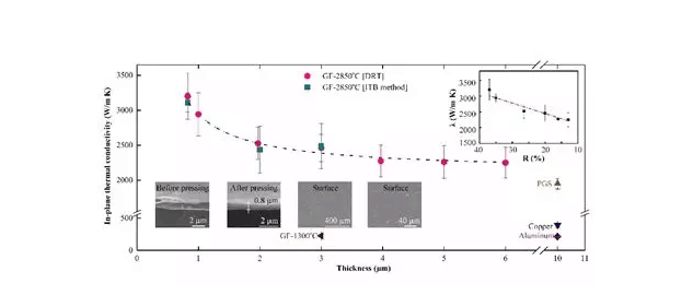 圖2. 28500C,13000C處理的石墨烯薄膜, 商用碳化石墨薄膜橫向熱導(dǎo)率,銅,鋁熱導(dǎo)率的比較。測(cè)試方法:真空焦耳自加熱及熱橋發(fā)。圖中照片展示了28500C處理及壓延過(guò)的石墨烯薄膜的截面及表面。圖中插圖展示石墨烯薄膜橫向熱導(dǎo)率與無(wú)序疊加排列的石墨烯的相對(duì)體積含量之間的關(guān)系。