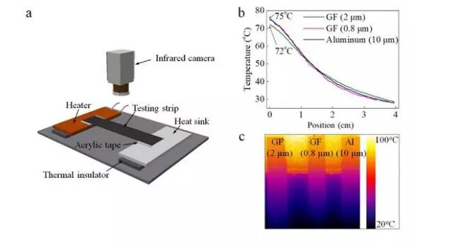 圖3. 石墨烯新型散熱片的展示。a)熱測(cè)試平臺(tái). b)0,8微米, 2微米厚28500C熱處理過(guò)石墨烯薄膜與10 微米鋁膜的溫度分布比較. c)紅外照片。